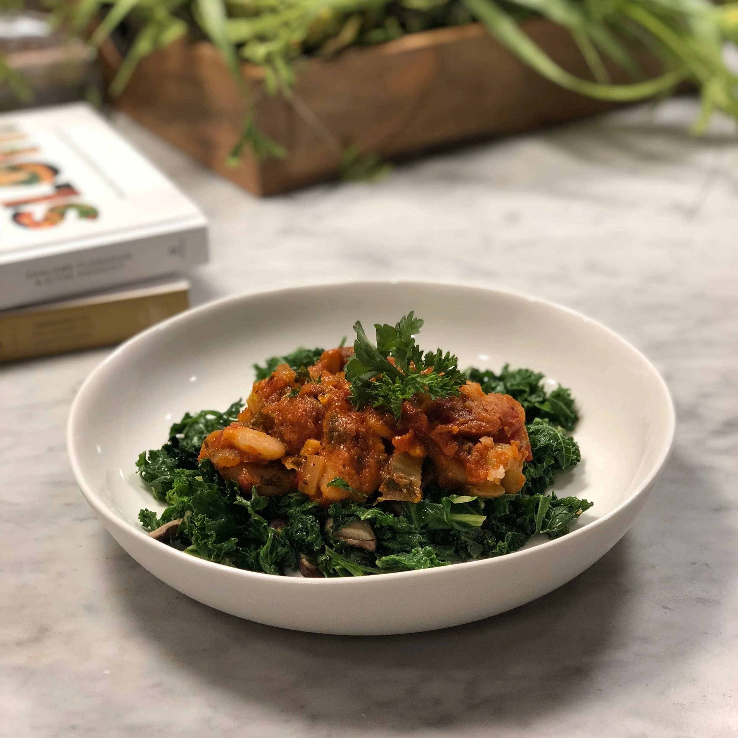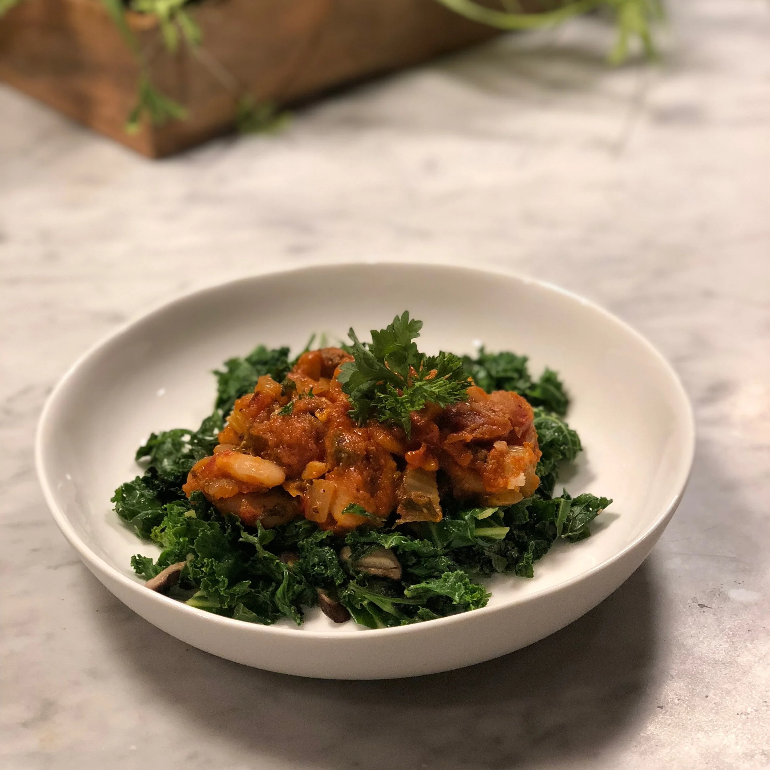 I served this recipe over some kale sautéed in EVOO with salt & pepper and with a bit of crusty bread. It is heaven.