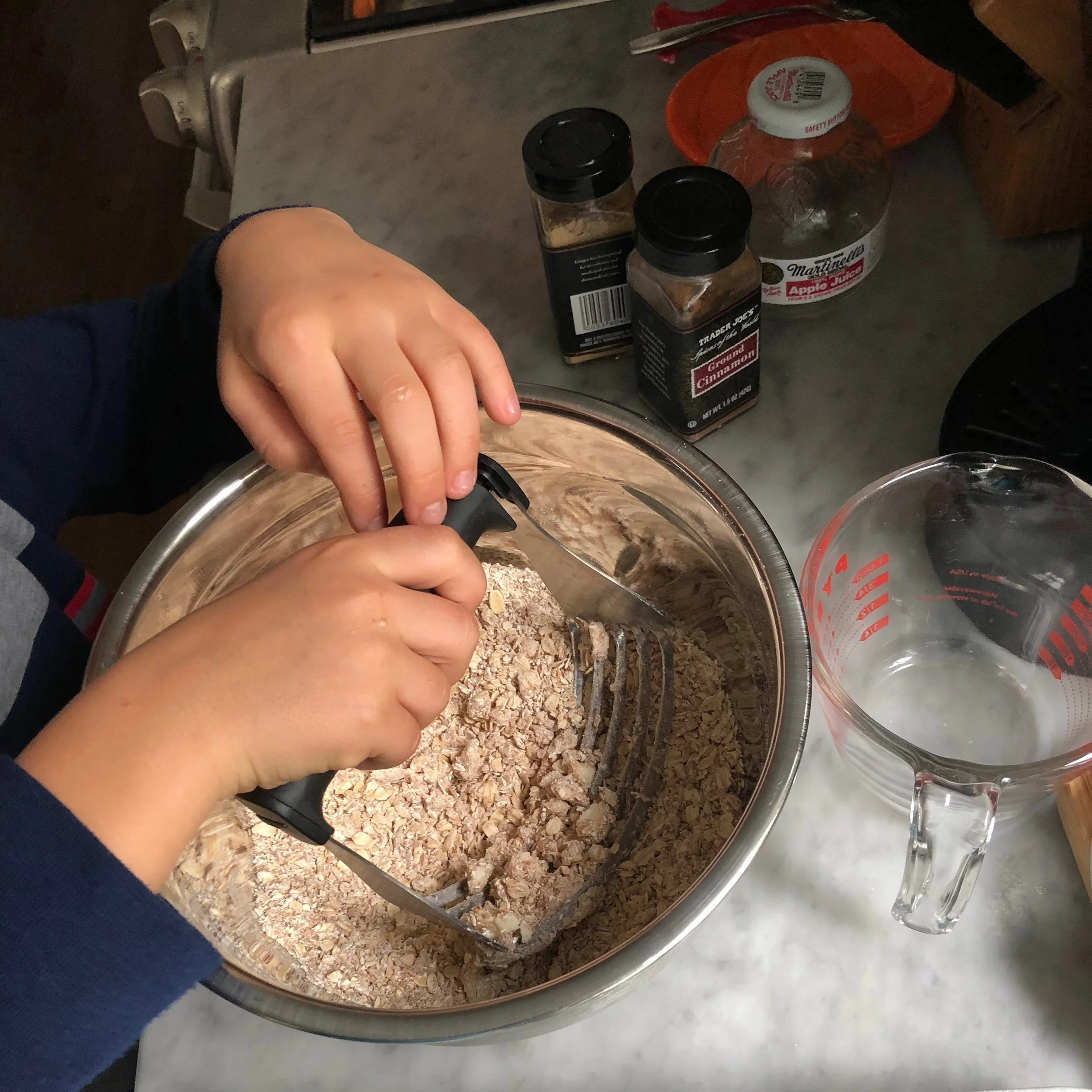 5. While the apples are softening, mix the ingredients for the topping. I used a pastry blender tool, but a food processor or fork + elbow grease will work too. Mix until crumbly.