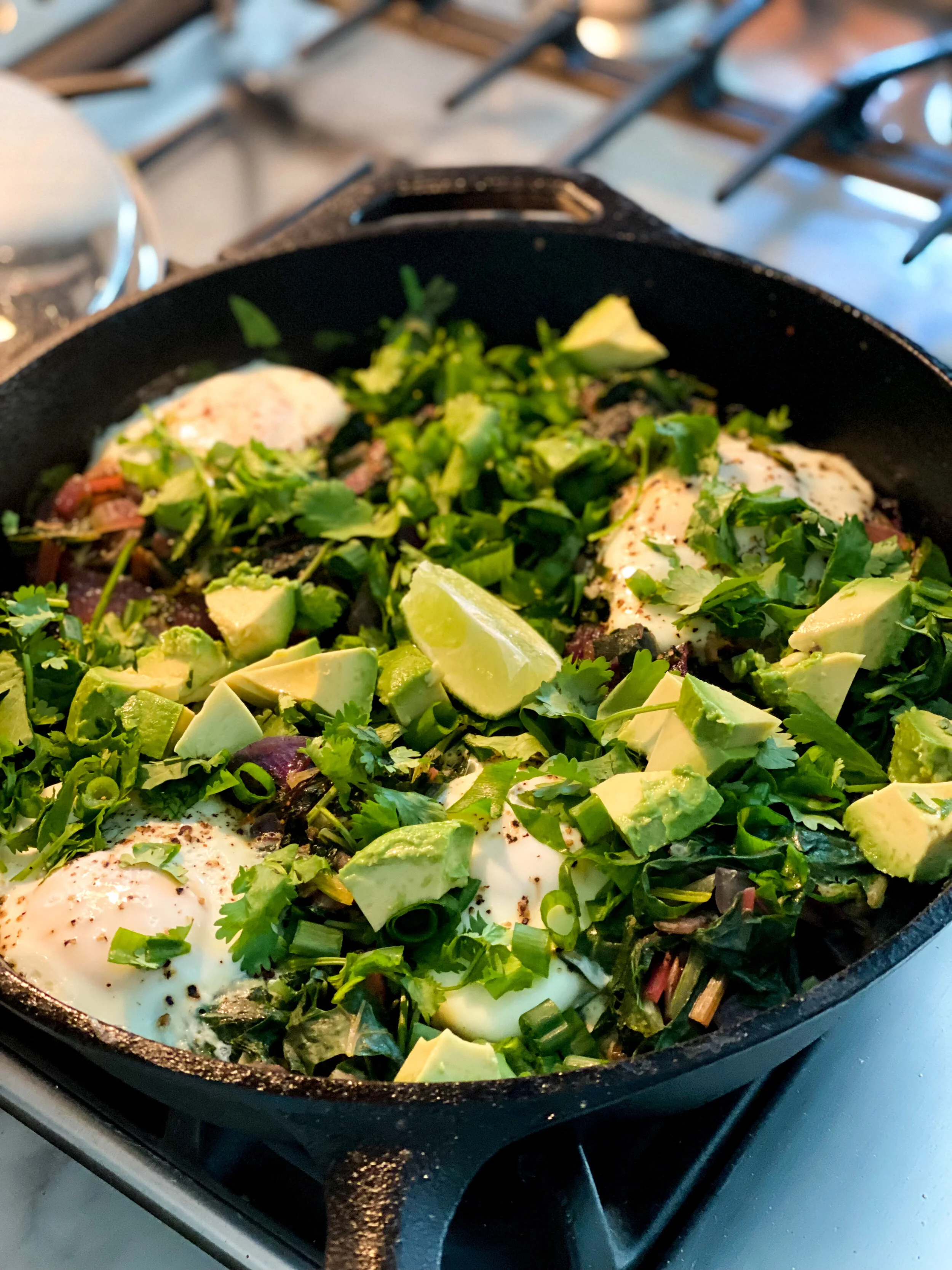 But sometimes nightshades - which includes tomatoes, bell peppers, eggplant and certain spices like paprika - can be hard on those with a sensitivity to this class of plants. This can present as extra achey joints or digestive issues. So we’ve created a GREEN shakshuka without traditional tomatoes and added a little pizazz with rainbow Swiss chard and red onions..